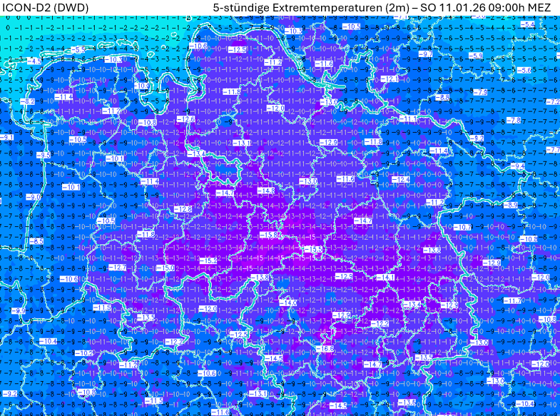 5h-Extremtemperaturen 2m (bis SO 11.01.26 09h MEZ) – ICON-D2 (Quelle: Wetter3)