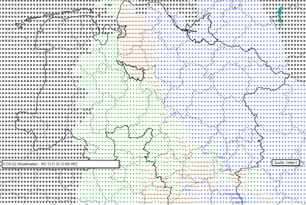 ICON-D2 Modellwetter für MO 12.01.26 12:00h MEZ (Quelle: Wetter3)