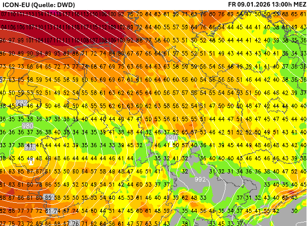 Spitzenböen (bis FR 09.01.26 13h MEZ) – ICON-EU (Quelle: Wetter3)