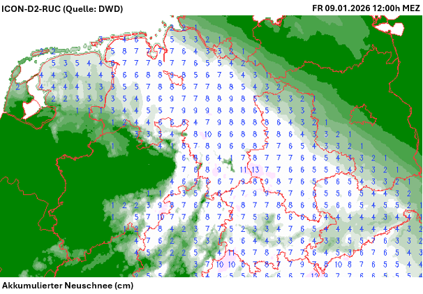 Akkumulierter Neuschnee (bis FR 09.01.26 12h MEZ) – ICON-D2-RUC (Quelle: Wetter3)