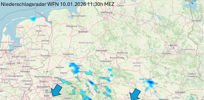 Vorsicht an der Südkante des Niederschlagsbandes: Hier wird örtlich gefrierender Regen bei Temperaturen zwischen -1°C und -2°C gemeldet, so z.B. um 9:30 Uhr in Bremen und auch in der Gegend um Bückeburg. Die Glätte sollte sich durch die Schneeauflage aber in Grenzen halten.
