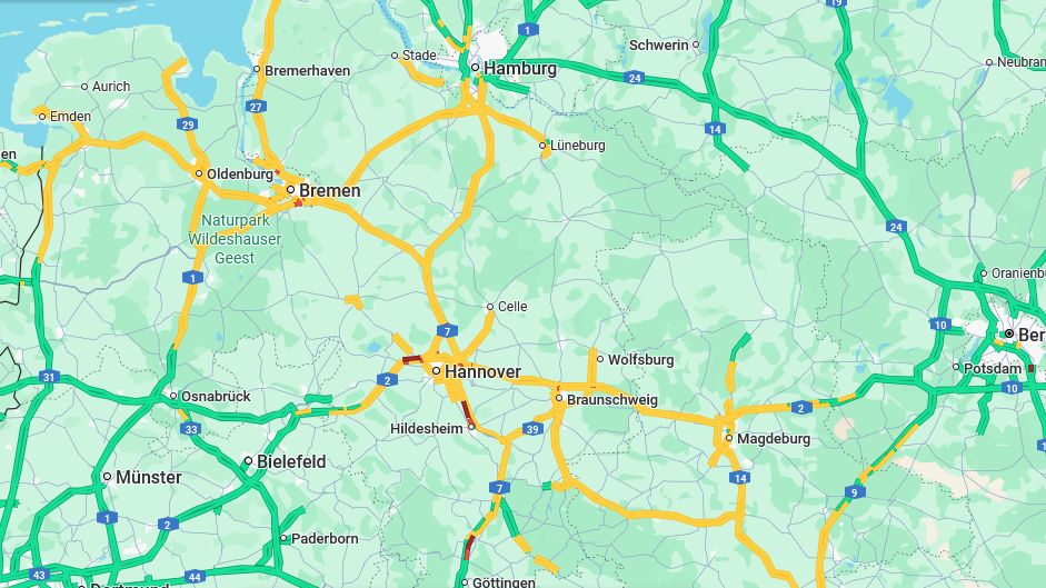 Die aktuelle Verkehrslage spiegelt gut wieder, welche Regionen von Schneefall und Schneeverwehungen am stärksten betroffen sind. In einem breiten Streifen diagonal über Niedersachsen geht es auf den Straßen nur langsam voran. Um Hanover herum gibt es auf der A2 und der A7 aktuell auch Vollsperrungen.
